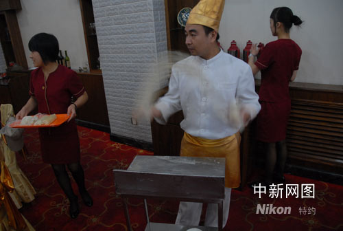 蘭州人吃牛肉面吃出了名堂,吃上了癮。如今,蘭州市的每條街巷,無論大小,至少都有一兩家牛肉面館。黃河岸邊的古城蘭州,彌漫在大街小巷的,永遠(yuǎn)有那股牛肉面的清香!疤m州人三天不來個‘牛大碗’就心火難捺”。聽起來有點(diǎn)夸張,不過,牛肉面確實已成為蘭州人生活中不可或缺的一部分。別以為煮面條加上牛肉片就是牛肉面了。蘭州牛肉面的精致與吃法考究令人瞠目。觀看拉面好像是欣賞雜技表演,拉面師傅操起面節(jié),一搓一拉,連抻數(shù)次,即變戲法似地拉繞出一碗細(xì)長的面條拉到最后時的“一拉一閃”又仿佛是舞蹈演員在揮舞著彩帶。王紅綱 攝