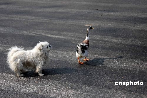 俗話說:狗攆鴨子呱呱叫,然而,家住河南洛陽濱河新村的徐先生家養(yǎng)的小狗“毛毛”和鴨子“鴨鴨”卻是一對莫逆好友,它們同吃、同住、同娛樂,整天形影不離。據(jù)徐先生說:“狗鴨已交往了3年,鴨鴨是孩子她嬸送給孩子飼養(yǎng)的寵物,2005年10月,抱回來的時候還是一只毛茸茸的小雛鴨,小家伙一見毛毛就嚇得渾身發(fā)抖,到處亂鉆。可是不知道什么時候,它卻與毛毛交上了朋友,還睡到了毛毛的狗窩里,兩個小家伙相依相偎的很和諧。直到2006年6月鴨鴨快一歲了它們才不在一個窩里住,但是鴨鴨和毛毛還是整天形影不離。中新社發(fā) 曾憲平 攝