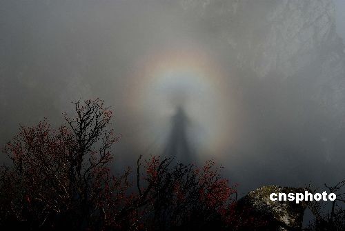 11月4日,廬山出現(xiàn)蔚為壯觀的云海,同時連續(xù)三次出現(xiàn)神奇的“佛光”,每次時間長達一小時左右,令來廬山的許多中外游客和攝影師們大飽眼福。廬山位于長江中游南岸江西省九江市南,鄱陽湖濱,大山、大江、大湖渾然一體,素以“雄、奇、險、秀”聞名于世。圖為4日廬山五老峰上出現(xiàn)的神秘的“佛光”奇觀。中新社發(fā) 胡國林 攝