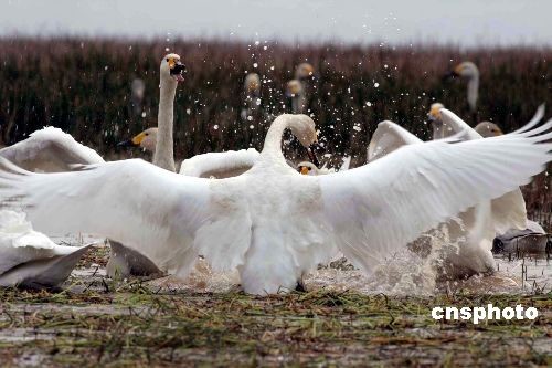 2008年11月15日,數(shù)千只大天鵝陸續(xù)飛抵江西九江縣東湖棲息覓食。由于鄱陽湖水位上漲,以及當(dāng)?shù)丨h(huán)境適宜等原因,大量國家二級保護動物天鵝前來越冬。中新社發(fā) 張 俊 攝