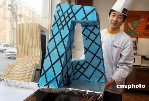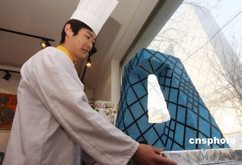 12月12日,在北京某蛋糕店,一位師傅正將自己制作的“央視蛋糕樓”擺上窗臺。近日,一個高約70厘米,模仿中央電視臺新臺址外形制作的蛋糕亮相北京某蛋糕店,吸引了路人的目光。中新社發(fā) 吳芒子 攝