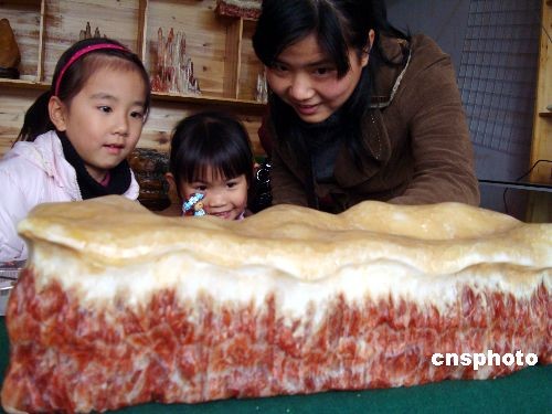 12月13日,在江蘇蘇州古鎮(zhèn)同里一家奇石店內(nèi)一種酷似豬肉的天然石頭吸引了眾多游客。據(jù)悉,這些“豬肉石”是在地質(zhì)運(yùn)動過程中與其他礦物質(zhì)接觸色化而成,不但長有“肉皮”,而且“瘦肉”和“肥肉”之分,呈現(xiàn)出多層次,十分逼真。中新社發(fā) 王建康 攝