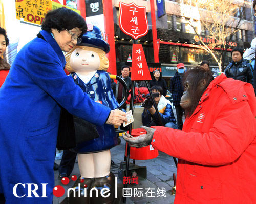 2008年12月15日,一只來自韓國高陽一家動物園的猩猩當日現(xiàn)身首爾明洞街頭,為慈善組織“救世軍”募捐!熬仁儡姟北驹鲁蹰_始在韓國各大城市街頭接受社會捐贈。