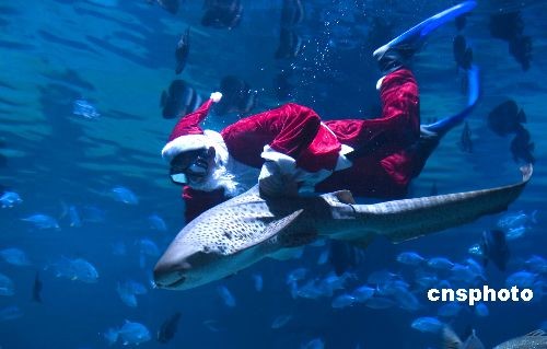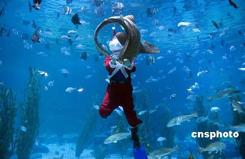 12月24日,圣誕節(jié)來(lái)臨,“圣誕老人”在杭州極地海洋公園與海洋動(dòng)物共度圣誕,不騎麋鹿改騎魚(yú)。中新社發(fā) 王磊 攝
