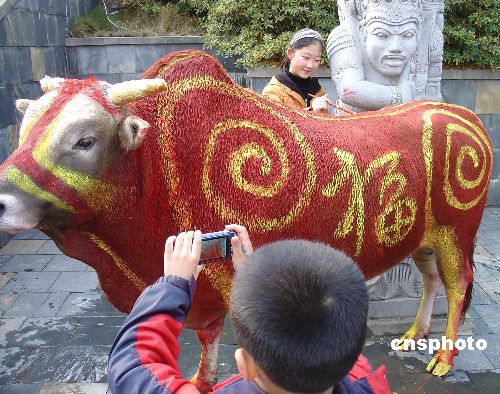 牛年春節(jié)將近,長(zhǎng)沙世界之窗內(nèi)愛玩的孩子們圍著一頭黃牛,為它涂上絢麗的色彩,形成創(chuàng)意十足的“!弊謭D案,用時(shí)尚的彩牛迎接即將到來的牛年春節(jié)。中新社發(fā) 肖前輝 攝