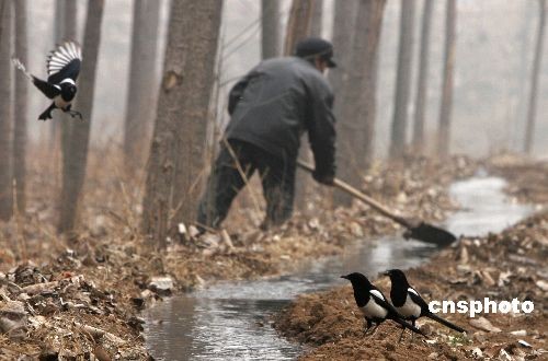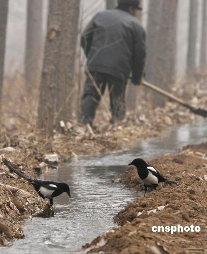 2月6日,河南洛陽嵩田湖鎮(zhèn)農(nóng)民引來嵩伊渠水流灌溉干旱的油菜地,一些喜鵲也趁機追逐水流,嬉戲解渴。中新社發(fā) 張曉理 攝
