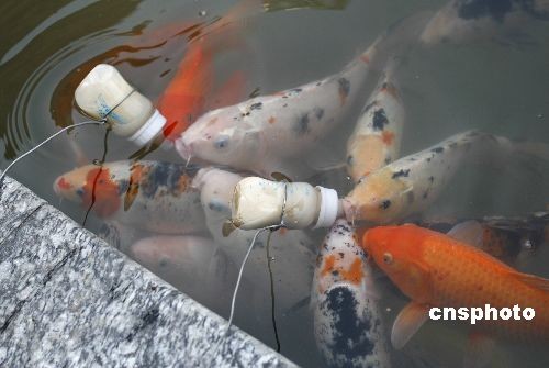 3月中旬,工作人員喂養(yǎng)“喝奶”的魚。在浙江東陽橫店影視城香港街景點內(nèi),養(yǎng)在水壇中的觀賞錦鯉是普通錦鯉與日本某錦鯉雜交后培育的品種,喂養(yǎng)它們則需要將飼料裝灌進嬰幼兒奶瓶中,該飼料的顏色如“乳奶”一般,然后將奶瓶用鐵絲系住放入水中,隨后,這些魚兒就會圍攏過來,爭搶著用奶嘴吸“奶”喝了。