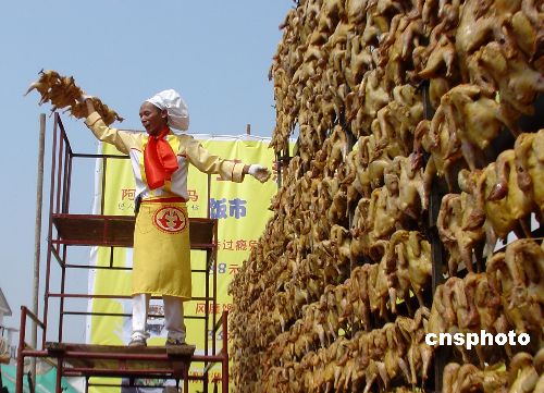 10月19日,在廣西南寧舉行的第17屆中國(guó)廚師節(jié)暨東南亞國(guó)際旅游美食節(jié)上,廣西廚師阿炳師傅一人同時(shí)燒烤2008只雞沖刺吉尼斯世界記錄,以此舉迎接2008年奧運(yùn)會(huì)在北京舉行。中新社發(fā) 楊志雄 攝