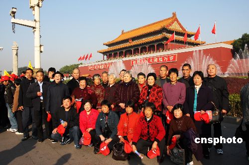 10月21日,中國共產(chǎn)黨第十七次全國代表大會在北京人民大會堂閉幕,在天安門廣場上關注大會盛況的游人爭相拍照留念。中新社發(fā) 鄭雄增 攝
