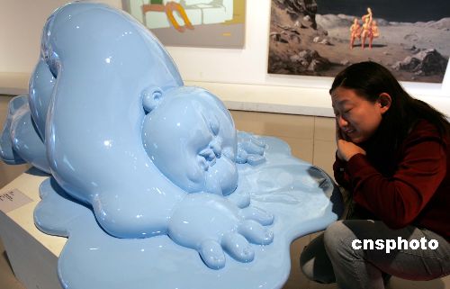 正在上海舉行的動漫美學(xué)雙年展有許多作品趣味逗人,一名觀眾在《睡著了》作品旁做模仿狀。據(jù)悉,參展的近百件作品來自意大利、美國、中國大陸和臺灣地區(qū)。中新社發(fā) 潘索菲 攝