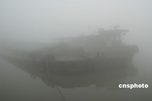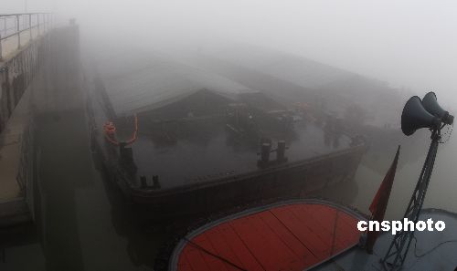 11月7日晨,一船隊因濃霧彌漫無法航行。當日,大運河山東臺兒莊航段濃霧彌漫,能見度不足20米,萬年船閘和臺兒莊船閘從早晨開始全線停止放船。停航造成至少近300艘船只短暫滯留,濃霧給船隊通航和船民生活帶來不便。中新社發(fā) 高啟民 攝