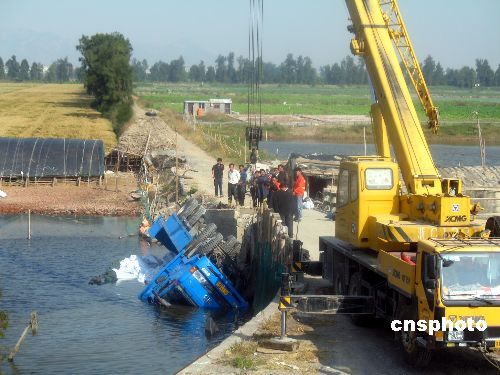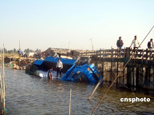 11月7日早晨5時(shí)許,一輛大貨車行駛至浙江溫嶺箬橫鎮(zhèn)西浦村新塘橋時(shí),壓斷小橋后貨、車和人一起翻入河里,幸好河水不深,駕駛室內(nèi)3人從車窗爬出逃生。據(jù)了解,此橋是該市十幾年前修筑東浦海塘?xí)r,為方便小型載貨車運(yùn)送石料而修筑,多年來該橋只能承受小貨車同行,且橋面已有多處開裂。據(jù)悉,肇事車輛車身重8000公斤,加上載貨5000多公斤,共計(jì)13000公斤。中新社發(fā) 林貽高 攝