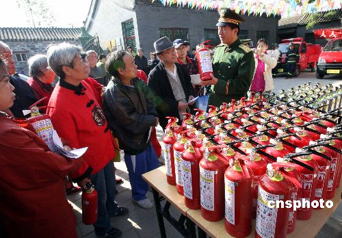 十一月八日,“11.9”消防宣傳日前夕,北京西城消防官兵來到屬地的社區(qū),為民眾發(fā)放滅火器并現(xiàn)場演示滅火器的使用方法,宣傳家庭中火災(zāi)的撲救等常識,提高市民的防范意識。中新社發(fā) 任海霞 攝