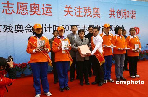 11月11日,主題為“微笑北京、志愿奧運、關(guān)注殘奧、共創(chuàng)和諧”的2008北京殘奧會倒計時300天志愿者主題活動,在北京東四奧林匹克社區(qū)公園舉行,《北京殘奧會志愿者培訓教材》中文版和盲文版首發(fā),同時為第二批奧運會、殘奧會志愿者培訓基地授牌。中新社發(fā) 杜洋 攝