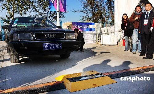 11月16日,北京奧運(yùn)場(chǎng)館安保工作面向境內(nèi)外記者開放,一百余位記者在2008奧運(yùn)柔道賽館——北京科技大學(xué)體育館體驗(yàn)了快速車檢和人身安檢。北京奧運(yùn)安保協(xié)調(diào)小組辦公室常務(wù)副主任、奧運(yùn)安保指揮中心常務(wù)副總指揮劉紹武在現(xiàn)場(chǎng)介紹,一部X光機(jī)和兩部安檢門為一套系統(tǒng),在一小時(shí)內(nèi)可完成對(duì)八百名觀眾的安全檢驗(yàn),平均不到五秒鐘可放行一人。中新社發(fā) 鄭雄增 攝