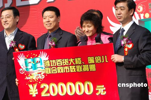 11月21日,奧運(yùn)冠軍高敏在山東濰坊參加大型愛心捐贈儀式。當(dāng)日,濰坊百貨大樓與中韓合資暖倍兒服飾有限公司向該市殘疾人聯(lián)合會捐贈價值20萬元的保暖內(nèi)衣。中新社發(fā) 王志德 攝