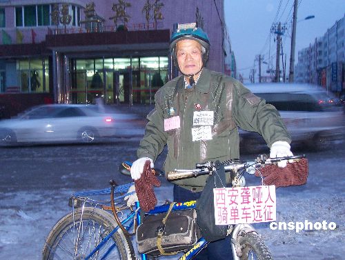 11月28日,來自陜西西安的一位頭發(fā)花白、精神矍鑠的聾啞老人唐應(yīng)成騎著單車抵達黑河市福蘭賓館附近。為了完成自己“走遍全中國,宣傳2008年北京奧運會,成為全國聾啞第一人”的夢想,從1997年4月5日開始,在家人的全力支持下,62歲的西安聾啞老人唐應(yīng)成騎單車,先后沿四川、云南、湖北、湖南、廣東、海南、廣西、新疆、山西、內(nèi)蒙古一路走了下來,經(jīng)過長達十年零三個月的艱苦跋涉,已經(jīng)走過了全國27個省、市、自治區(qū),行程42萬多公里,以自己獨特的方式,表達了一個普通公民對北京2008年奧運會的支持。經(jīng)過與老人用紙和筆的采訪和溝通,老人從隨行的包裹中拿出許多各地對他的相關(guān)報道。唐應(yīng)成每到一地,除了收集當?shù)厝罕婈P(guān)于申辦奧運的祝福語、宣傳畫外,還用隨身攜帶的照相機,拍下所到之處的風(fēng)土人情和自然風(fēng)光,匯集成簡單的畫冊,作為遠征的見證。