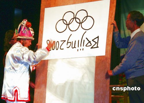 11月29日,遼寧沈陽鄭錫平在八一劇場北方老齡藝術(shù)團(tuán)5周年年慶會上,用自制的自來水毛筆表演“倒著一筆”分別寫完“2008北京奧運”、“五環(huán)”、“迎奧運”等,得到與會人員的贊嘆。