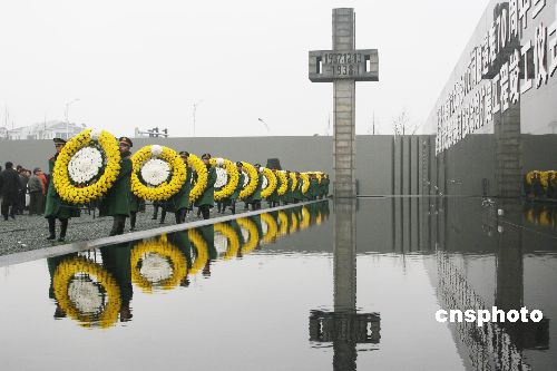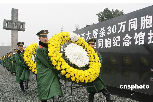 2007年12月12日,在侵華日軍南京大屠殺遇難同胞紀(jì)念館集會廣場上,武警南京市支隊國旗護衛(wèi)隊隊員正在進行向南京大屠殺遇難同胞敬獻花圈儀式排練。12月13日是南京大屠殺紀(jì)念日,南京市將在此舉行悼念侵華日軍南京大屠殺30萬同胞遇難70周年紀(jì)念儀式暨侵華日軍南京大屠殺遇難同胞紀(jì)念館擴建工程竣工儀式。中新社發(fā) 韓華 攝