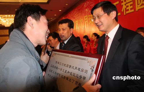 中國航天科技集團(tuán)公司新任副總經(jīng)理袁家軍(右)等向為該集團(tuán)承擔(dān)首次月球探測工程研制任務(wù)提供幫助和支持的協(xié)作、配套單位授牌。