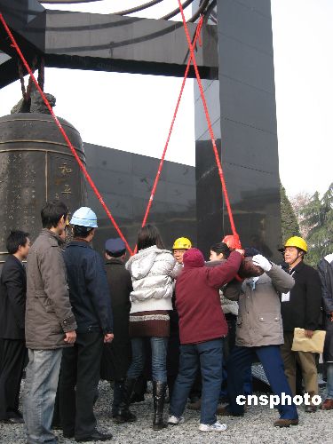 十二月十三日十時,江蘇省各界人士八千多人在新落成的侵華日軍南京大屠殺遇難同胞紀念館新館前的和平廣場隆重舉行“悼念侵華日軍南京大屠殺三十萬同胞遇難七十周年暨侵華日軍南京大屠殺遇難同胞紀念館擴建工程竣工儀式”。南京大屠殺幸存者代表、青少年代表、擴建工程建設者代表放飛和平鴿,并撞響了“和平大鐘”。中新社發(fā) 朱曉穎 攝