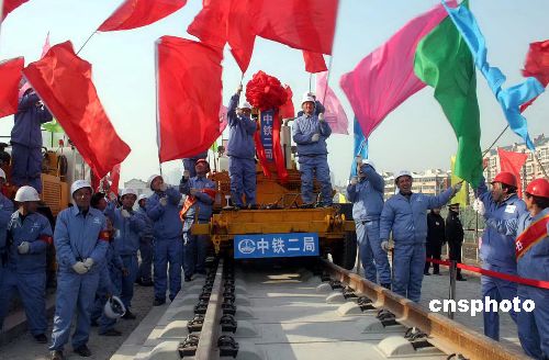 12月16日,備受關(guān)注的中國(guó)大陸首條高等級(jí)城際鐵路——京津城際快速鐵路鋪軌工程,繼12月10日北京區(qū)率先鋪通后,天津區(qū)亦宣告完成。總投資133.24億元的京津城際快速鐵路工程,于2005年7月4日開(kāi)工,計(jì)劃2008年第一季度開(kāi)始綜合調(diào)試及試運(yùn)營(yíng),北京奧運(yùn)會(huì)開(kāi)幕前正式開(kāi)通運(yùn)營(yíng)。京津城際快速鐵路建成通車(chē)后,將實(shí)現(xiàn)京津兩地30分鐘內(nèi)通達(dá)。中新社發(fā) 段毅剛 攝
