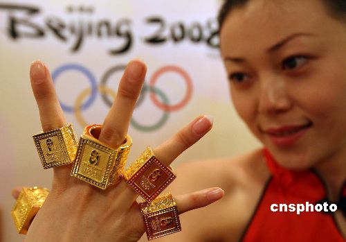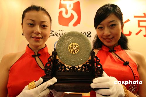 十二月十九日,由北京繁榮文化發(fā)展有限公司推出的五十余款奧運紀念章與消費者見面,此舉使得北京奧運特許商品這一大家族又增添了“新成員”。這些限量發(fā)行的“新成員”,多為大眾化商品,價格在一百元人民幣的就有二十多種,內容涉及不同題材,如體育、科技、文化、城市等,其中最吸引人的還是設計制作獨特的奧運金章玉璧等高端商品。中新社發(fā) 任海霞 攝
