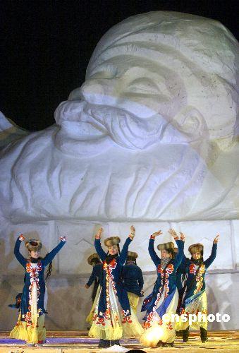 圖為在巨型雪雕“快樂的阿凡提”前,維吾爾族舞蹈演員跳起少數(shù)民族舞蹈。