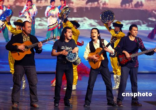 2007年12月31日晚,中國(guó)中央電視臺(tái)在北京舉辦2008年元旦雙語(yǔ)(漢語(yǔ)、英語(yǔ))晚會(huì),中國(guó)及日本、韓國(guó)、泰國(guó)、馬來(lái)西亞、新加坡、印度等國(guó)家的藝術(shù)家同臺(tái)獻(xiàn)藝,歡度新年佳節(jié),他們以歌曲、舞蹈、雜技、魔術(shù)、服裝秀、戲曲等藝術(shù)形式,祝福各國(guó)人民愉快。中新社發(fā) 宋吉河 攝