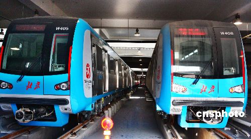 1月2日,北京地鐵10號線萬柳車輛段,工作人員對首批地鐵車輛進(jìn)行檢測調(diào)試工作。據(jù)悉,北京地鐵10號線一期(含奧運支線)全線軌道具備行車條件后,首批車輛和地鐵運營公司已進(jìn)駐該車輛段,今年2月將開始空載試運行,6月載客試運行。首批車輛的車頭為藍(lán)色,并刷有紅色的中國印標(biāo)識,車體為不銹鋼本色,車內(nèi)白色座椅、紅色扶手和拉環(huán),車門有扶手。中新社發(fā) 鄭雄增 攝