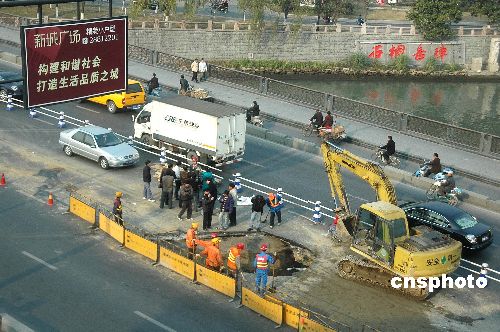 1月7日,杭州艮山運河橋機動車道橋面發(fā)生局部坍塌事故,坍塌形成的窟窿直徑約5米,深約2米,面積達30多平方米,所幸沒有造成人員傷亡和車輛受損,但對交通造成較大影響,具體原因尚待有關(guān)部門調(diào)查。據(jù)了解,艮山運河橋始建于1988年,由于交通流量較大,曾多次進行過比較全面的修繕和拓寬,該橋曾發(fā)生過橋面人行道突然坍塌導致行人墜落的事故。中新社發(fā) 引煒 攝