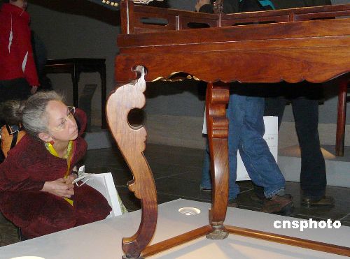 2008年1月9日,“2008中國(guó)古典家具精品展暨國(guó)際學(xué)術(shù)研討會(huì)”在北京拉開帷幕。這是首次舉辦專門針對(duì)中國(guó)古典家具研究與展示的國(guó)際性活動(dòng),十幾位海內(nèi)外古典家具研究學(xué)者和專家,將就中國(guó)古典家具的歷史與現(xiàn)狀、傳承與發(fā)展等問題進(jìn)行深入的探討,同時(shí)集中展出了近60件來(lái)自海內(nèi)外著名藏家的明清家具頂尖精品。中新社發(fā) 金城 攝