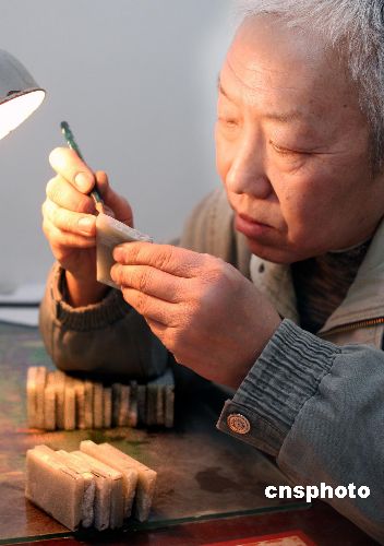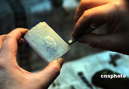 1月11日,北京玉器廠工藝師正在加工2008套12生肖玉牌。這2008套12生肖玉牌為中國國際藝術聯(lián)盟制作,作為奧運收藏紀念品將在北京2008年奧運會前完成上市。其圖案由李燕、金鴻鈞等12位中國當代著名畫家創(chuàng)作。中新社發(fā) 宋吉河 攝