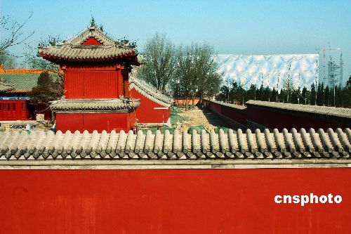 1月11日,為保持明代建筑風貌,曾迫使北京的國家游泳中心“水立方”施工位置北移的北頂娘娘廟,近日完成階段性施工。位于“水立方”南側的北頂娘娘廟為明代廟宇,是北京歷史上著名的“五頂八廟”之一、北京城中軸北延長線上的一個標志性建筑。修繕一新的北頂娘娘廟紅墻、琉璃瓦的古典味,與“水立方”的現(xiàn)代化遙遙相對形成強烈對比。中新社發(fā) 鄭雄增 攝