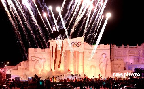 1月11日晚,2008中國沈陽國際冰雪節(jié)開幕。本屆冰雪節(jié)的雪雕和冰雕超越歷屆冰雪節(jié),創(chuàng)下數(shù)量、高度和規(guī)模之最。開幕式上《從雅典到北京》、《龍騰奧運》等六座大型雪雕與杭州古塔、沈陽舍塔等建筑冰雕等點亮了主會場棋盤山之夜。 中新社發(fā) 羅瀾 攝