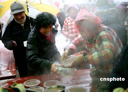 1月15日,南京市民排隊(duì)領(lǐng)取毗盧寺派送的臘八粥。當(dāng)日是中國(guó)傳統(tǒng)的“臘八節(jié)”,民間有喝臘八粥的習(xí)俗,南京名剎毗盧寺免費(fèi)向市民提供28888份臘八粥,吸引了眾多市民排長(zhǎng)隊(duì)領(lǐng)取。據(jù)了解,毗盧寺當(dāng)天免費(fèi)提供的臘八粥,是由紅豆、花生米等38種原料用微火熬制而成,其中僅糯米就有2888斤。中新社發(fā) 鐘山 攝