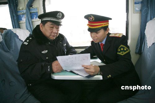圖為南昌鐵路局N527/N528次列車列車長王水英與乘警長陳曉波十六日在行駛的列車上抓緊研究春運治安方案。