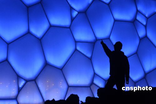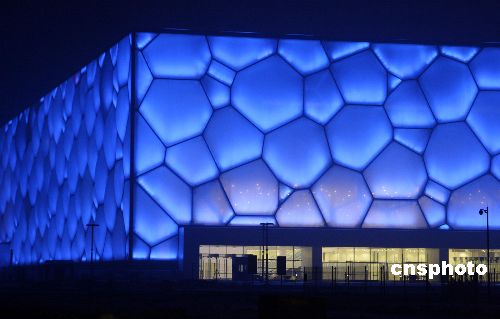 1月19日晚,北京奧運工程之一的國家游泳館(“水立方”)進行調(diào)試造型燈光,“水立方”中每個氣泡被照射上藍色燈光,令人暢想奧運水世界。據(jù)悉,1月31日這里將舉行奧運測試賽,屆時“水立方”將被照射更多的彩色燈光。 中新社發(fā) 吳芒子 攝