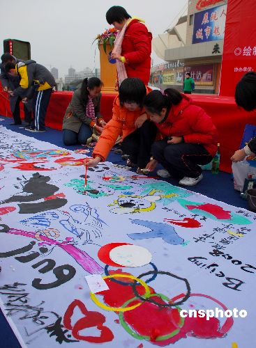 1月20日,山東威海舉辦慶祝北京奧運(yùn)會(huì)200天倒計(jì)時(shí)系列活動(dòng),活動(dòng)項(xiàng)目包括:由34輛奇瑞QQ汽車擺成2008字樣、百名騎自行車的志愿者迎奧運(yùn)健身行、兒童繪制迎奧運(yùn)百米長卷,以及百姓撞鐘祈福等內(nèi)容。中新社發(fā) 海云飛 攝