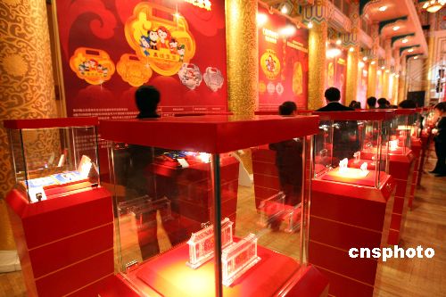 一月二十日,為紀念奧運會倒計時200天,由北京奧組委主辦的主題為“中國印·奧運年·華夏!眾W運特許貴金屬賀歲新品上市推介會舉行。七十款具有中國特色的奧運特許商品,包括中國印、長命鎖、紅燈籠、中國結(jié)及中國福等。中新社發(fā) 任海霞 攝