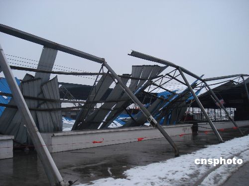 2008年1月20日凌晨,由于連日的暴雪,導(dǎo)致安徽省合肥市包河苑農(nóng)貿(mào)市場上千平方米蔬菜大棚被雪壓塌。由于連降暴雪,安徽合肥等地,不少工廠倉庫和農(nóng)貿(mào)市場的簡易大棚被雪壓塌,目前沒有造成人員傷亡。中新社發(fā) 何保豐 攝