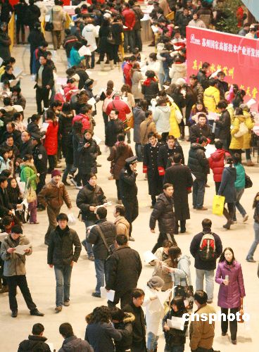 1月26日,2008年蘇州春季人才交流大會(huì)暨畢業(yè)生雙選會(huì)開場(chǎng)。據(jù)了解,本次“雙選會(huì)”有近500家用人單位進(jìn)場(chǎng)招聘,為求職者提供12000多個(gè)職位。其中事業(yè)單位需求崗位1300余個(gè)、企業(yè)單位需求崗位10900多個(gè),博士、碩士生及本科以上學(xué)歷占需求總量的53%以上。據(jù)主辦方稱,當(dāng)日進(jìn)場(chǎng)人數(shù)可逾6萬。中新社發(fā) 蘇秀 攝