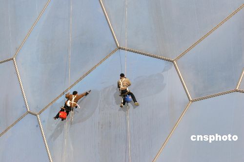 兩名工人正在清洗北京奧運(yùn)會游泳館“水立方”的外墻膜。
