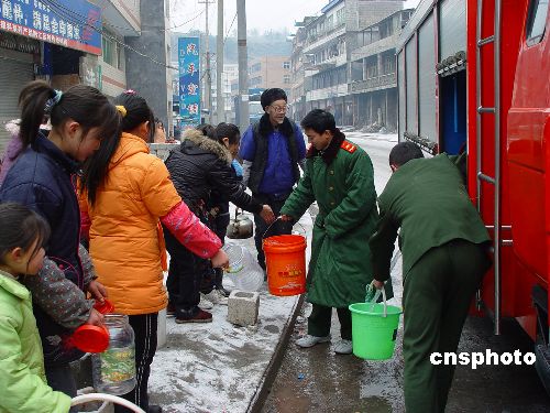 1月28日,重慶黔江消防官兵為自來水中斷近一周的交通西路居民送水到戶。連日來,重慶市近10個區(qū)縣普降大雪,部分地區(qū)積雪最深度甚至超過20厘米,由于大雪覆蓋,天氣寒冷,一時(shí)間,黔江、武隆、酉陽、彭水等區(qū)縣均出現(xiàn)公路結(jié)冰、電力中斷、市民飲水困難情況,對群眾生活造成極大困繞。中新社發(fā) 王松 攝