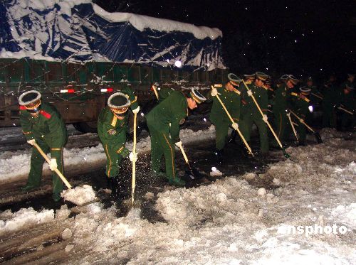 1月28日下午16時,武警江蘇總隊(duì)1500余名官兵緊急奔赴南京長江二橋除雪抗災(zāi)。南京長江二橋是南北交通大動脈,更是向南京市區(qū)運(yùn)輸新鮮農(nóng)產(chǎn)品的主要通道,每天車流量達(dá)到5萬余次。暴雪已使二橋交通中斷,近兩千車輛被迫停泊在風(fēng)雪中。截至1月29日凌晨2時許,經(jīng)過武警官兵連續(xù)10多個小時的艱苦奮戰(zhàn),約30公里的高速公路重新暢通。 中新社發(fā) 唐占軍 攝