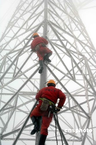 圖:浙江省冰凍嚴(yán)重 送變電職工搶修超高壓線