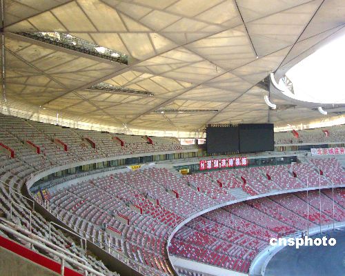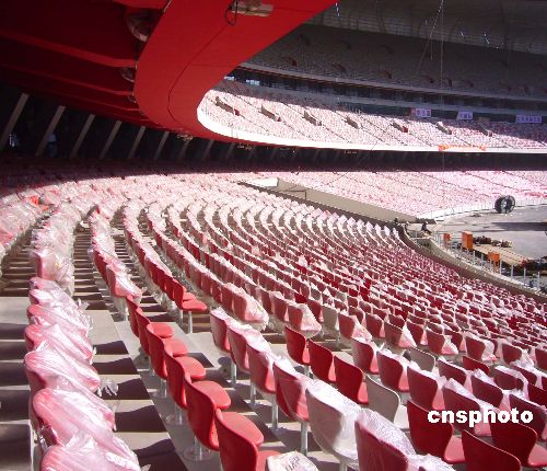 2008年1月29日,由中國石化承擔(dān)的北京國家體育場“鳥巢”8萬個固定座椅的原料研發(fā)、外形設(shè)計、生產(chǎn)制作及現(xiàn)場安裝項目圓滿完工。各項收尾工作正加緊進(jìn)行。據(jù)悉,座椅采用“中國紅”和“長城灰”兩種顏色,而且在室外耐紫外線照射下,三年風(fēng)吹日曬顏色不發(fā)生變化。中新社發(fā) 玉龍 攝
