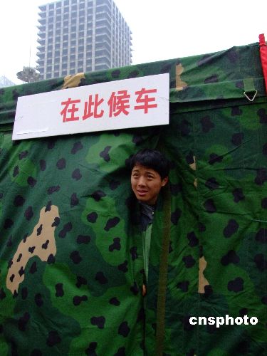1月31日,滯留旅客在南京軍區(qū)“硬骨頭六連”所在師官兵搭建的“野戰(zhàn)帳篷”里避寒。帳篷內(nèi)持續(xù)供暖,溫度達到23度左右。目前,該師共在杭州城站火車站、火車東站等地搭建野戰(zhàn)帳篷40多頂,鋪設床板500多塊,為近2萬名滯留旅客提供了暖身御寒之地,受到廣大群眾的廣泛贊譽。中新社發(fā) 邱柏星 攝
