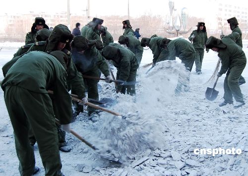 1月31日,解放軍官兵和交警在鏟除路面積雪。自1月12日以來,持續(xù)不斷的降雪、冰凍氣候,給河西走廊中部的甘肅臨澤縣人民生產生活和交通安全造成了嚴重影響。災情發(fā)生后,當?shù)攸h委政府積極采取多項措施,清除冰雪,確保道路交通安全暢通。中新社發(fā) 李自明 攝
