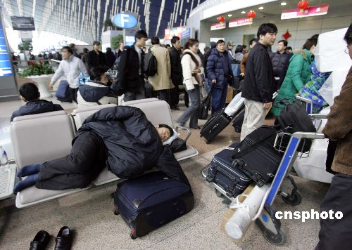 2月2日,上海再遇暴雪,浦東國際機場春運工作受到嚴(yán)重影響。僅2月1日,上海虹橋、浦東兩機場共延誤二百多個航班,取消十多個航班。圖為一位旅客在候機大廳酣睡。中新社發(fā) 潘索菲 攝